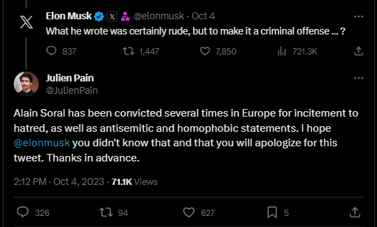 Ceci subvient en partie après que Elon Musk ait trouvé démesuré de condamner à de la prison ferme Alain Soral :