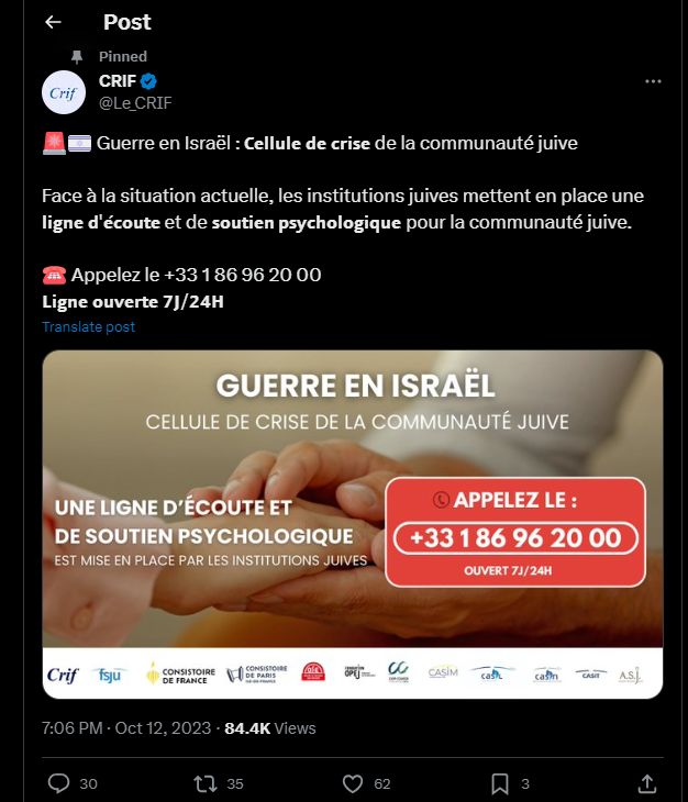 Face à la situation actuelle, les institutions juives mettent en place une 𝗹𝗶𝗴𝗻𝗲 𝗱'𝗲́𝗰𝗼𝘂𝘁𝗲 et de 𝘀𝗼𝘂𝘁𝗶𝗲𝗻 𝗽𝘀𝘆𝗰𝗵𝗼𝗹𝗼𝗴𝗶𝗾𝘂𝗲 pour la communauté juive.