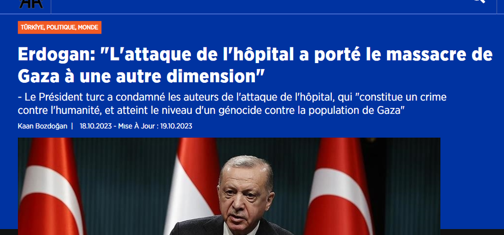 - Le Président turc a condamné les auteurs de l'attaque de l'hôpital, qui "constitue un crime contre l'humanité, et atteint le niveau d'un génocide contre la population de Gaza"