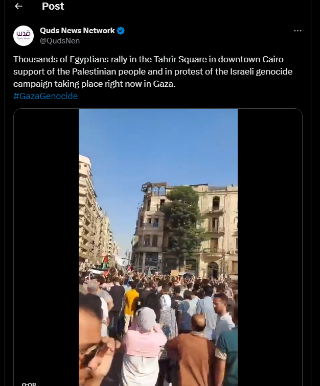 Des milliers d'Égyptiens se rassemblent sur la place Tahrir, au centre-ville du Caire, pour soutenir le peuple palestinien et pour protester contre la campagne de génocide israélienne qui se déroule actuellement à Gaza.