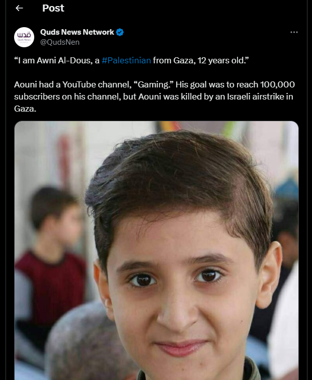 Aouni had a YouTube channel, “Gaming.” His goal was to reach 100,000 subscribers on his channel, but Aouni was killed by an Israeli airstrike in Gaza.