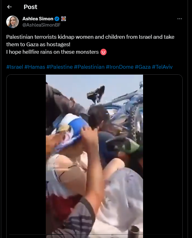 Je viens d'Israël, 1 000 blessés, 150 morts, 150 kidnappés et d'autres encore retenus en otages. Les missiles sifflent au-dessus de ma tête, les maisons brûlent, toute ma ville est enfumée.
