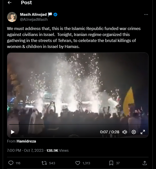 "Ce soir, le régime iranien a organisé ce rassemblement dans les rues de Téhéran, pour célébrer les meurtres brutaux de femmes et d'enfants en Israël par le Hamas."