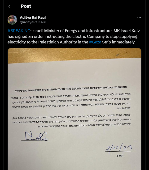 Le ministre israélien de l'Énergie et des Infrastructures, le député Israel Katz, a signé un arrêté ordonnant à la compagnie électrique de cesser immédiatement de fournir de l'électricité à l'Autorité palestinienne dans la bande de #Gaza.