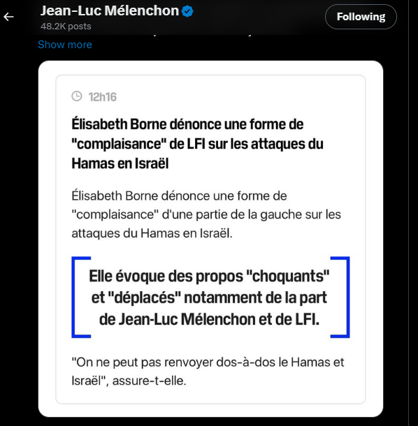 Des propos "totalement choquants" et "déplacés" pour Élisabeth Borne qui a jugé que le leader de LFI est "comme à son habitude dans une ambiguïté vis-à-vis d'Israël." La cheffe du gouvernement a ensuite estimé que "l'antisionnisme" des insoumis est "parfois une façon aussi de masquer de l'antisémitisme".