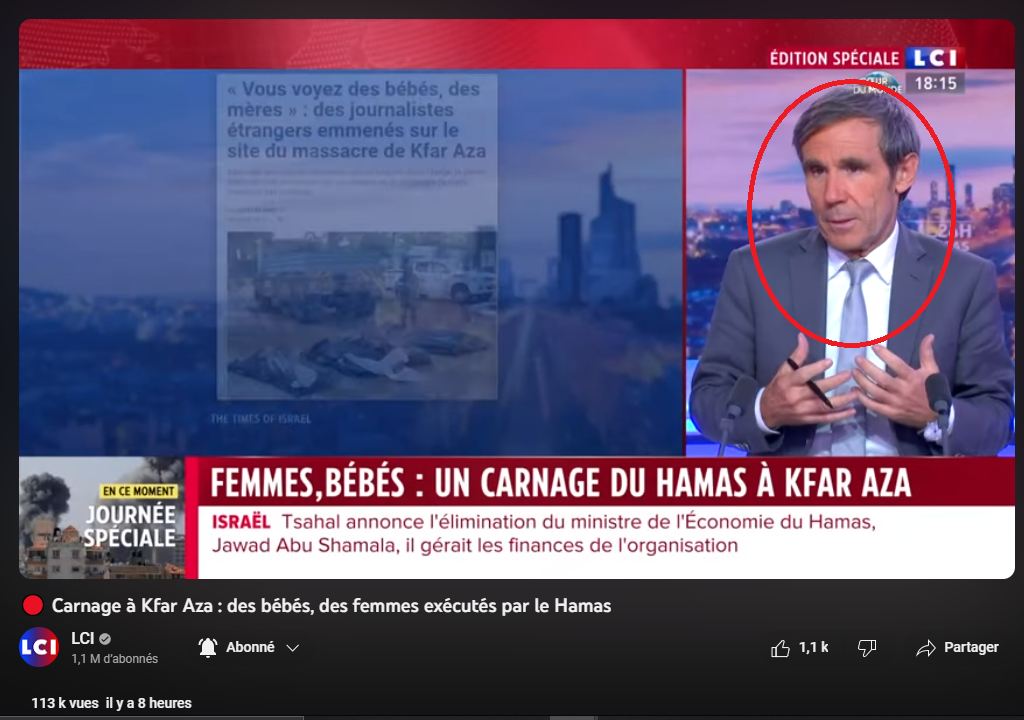 A 54 min, la reporter Anne Tivat dit que la rave party en Israël était une première pour les organisateurs dans ce pays. Que le lieu a été choisi l'avant-veille, que les participants ont été informés la veille et que donc comment le Hamas a pu savoir et préparer son opération. Avant de finir d'ajouter qu'un tel niveau de préparation aurait pu être l'oeuvre des forces israéliennes tellement c'est impressionnant