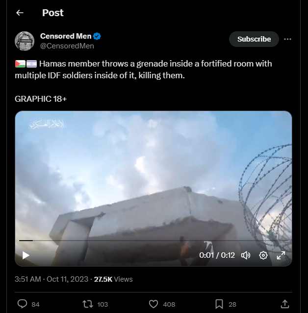 Un membre du Hamas lance une grenade dans une pièce fortifiée contenant plusieurs soldats de Tsahal, les tuant.