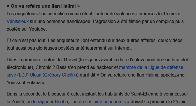 Dans la première, datée du 11 avril (trois jours avant la date d’enlèvement de son bracelet électronique), Chronic 2 Bass s’en prend au hackeur et membre de la Ligue de défense juive (LDJ) Ulcan (Grégory Chelli) à qui il dit« On va refaire une Ilan Halimi, appelez-moi Youssouf Fofana ».