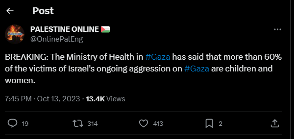 Le ministère de la Santé de #Gaza a déclaré que plus de 60 % des victimes de l'agression actuelle d'Israël contre #Gaza sont des enfants et des femmes.