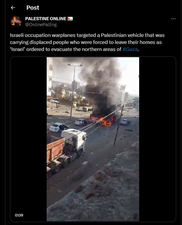 Les avions de guerre de l’occupation israélienne ont ciblé un véhicule palestinien qui transportait des personnes déplacées qui ont été forcées de quitter leurs maisons alors qu’« Israël » ordonnait d’évacuer les zones nord de #Gaza.