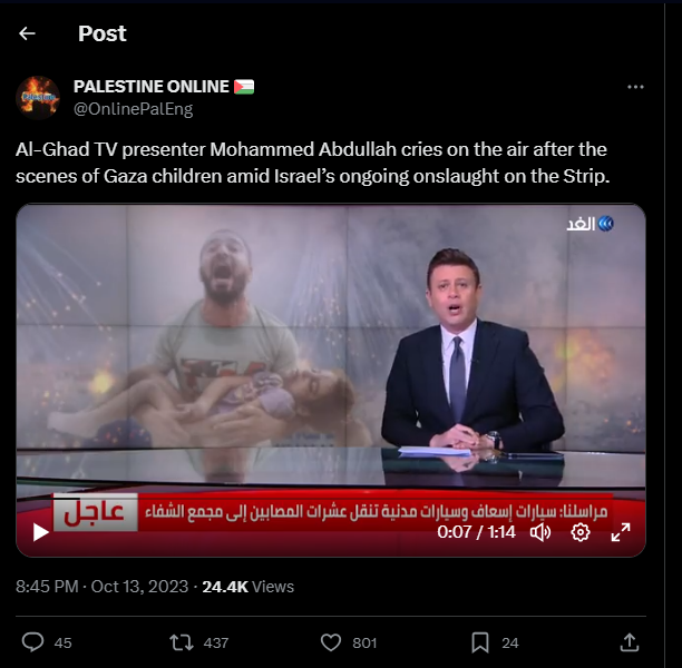Mohammed Abdullah, présentateur d’Al-Ghad TV, pleure à l’antenne après les scènes d’enfants de Gaza, au milieu de l’attaque continue d’Israël contre la bande de Gaza.
