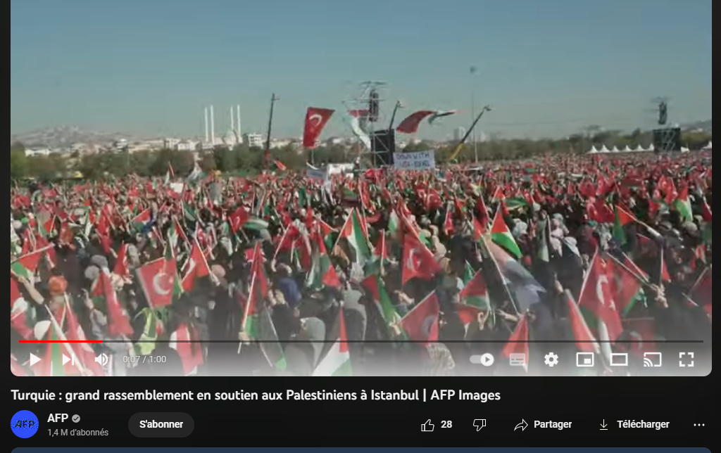 Des milliers de personnes se rassemblent sur la place Maltepe d'Istanbul pour une manifestation de soutien aux Palestiniens. Organisé à l'initiative du nouvel allié controversé du président turc Recep Tayyip Erdogan, le parti de la Cause libre, connu sous le nom de Huda-Par, ce rassemblement est la première manifestation massive en faveur des Palestiniens jamais organisée par un parti politique turc représenté au parlement turc.