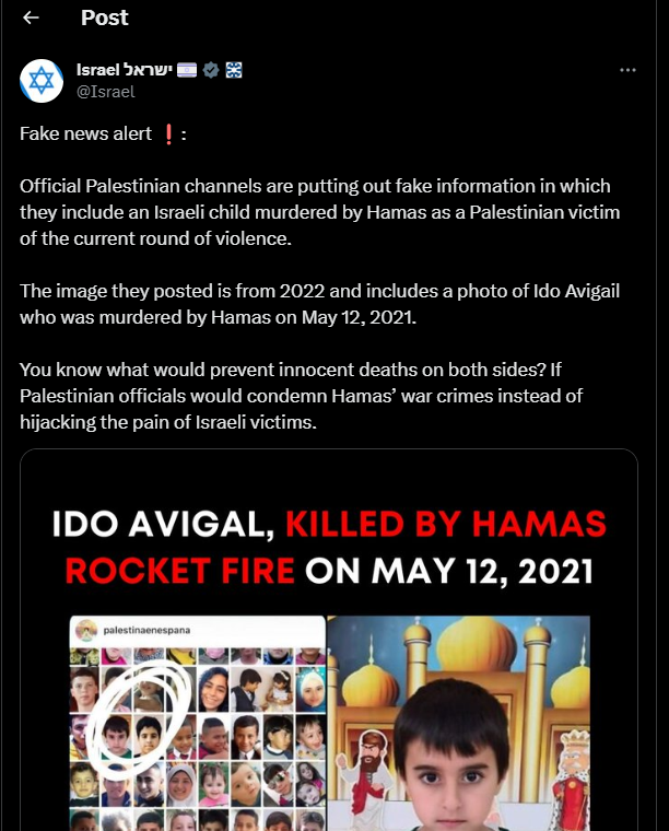 L'image qu'ils ont publiée date de 2022 et comprend une photo d'Ido Avigail qui a été assassiné par le Hamas le 12 mai 2021.