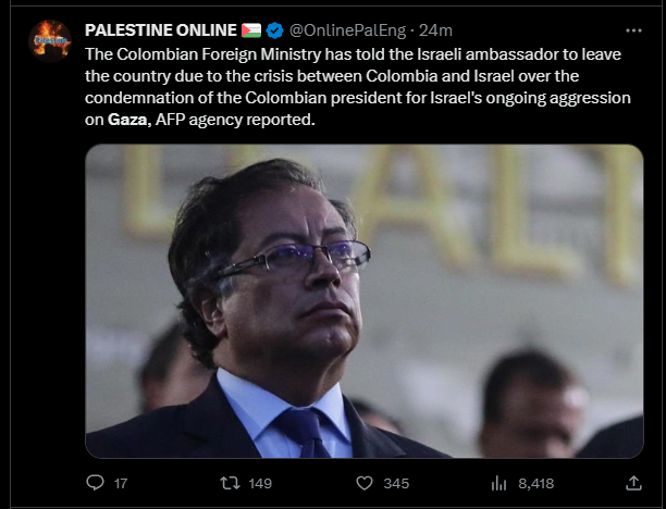 Le ministère colombien des Affaires étrangères a demandé à l'ambassadeur israélien de quitter le pays en raison de la crise entre la Colombie et Israël suite à la condamnation du président colombien pour l'agression israélienne en cours contre Gaza, a rapporté l'agence AFP.