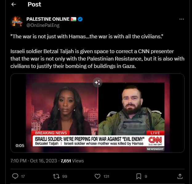 Le soldat israélien Betzal Taljah a la possibilité de corriger un présentateur de CNN en disant que la guerre n'est pas seulement contre la Résistance palestinienne, mais aussi contre les civils pour justifier leurs bombardements de bâtiments à Gaza.