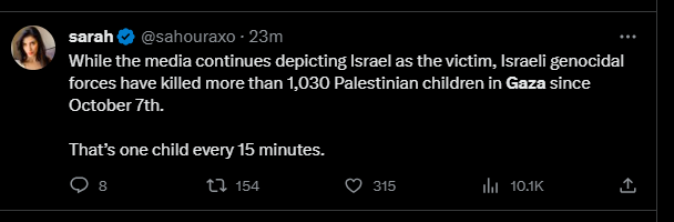 Alors que les médias continuent de présenter Israël comme la victime, les forces génocidaires israéliennes ont tué plus de 1 030 enfants palestiniens à Gaza depuis le 7 octobre.