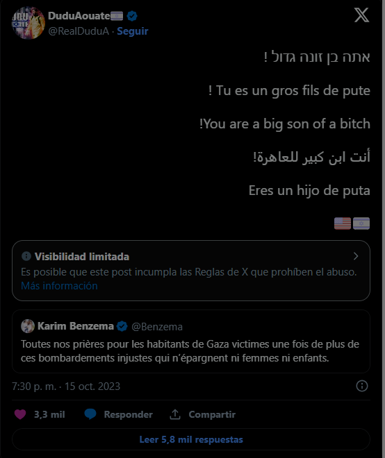 L'Algérien Benzema, 35 ans, a exprimé dimanche ses pensées et ses prières pour Gaza alors qu'Israël attaque le pays. Aouate a répondu par des mots durs en israélien, français (il a la double nationalité), anglais, arabe et espagnol.