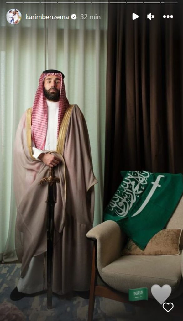 Dans ses stories Instagram, Benzema a également partagé une autre photo de lui tenant une épée. Cette épée est un élément présent sur le drapeau de l’Arabie saoudite, tel qu’il est conçu depuis le 15 mars 1973, bien qu’il ait été utilisé depuis 1932.