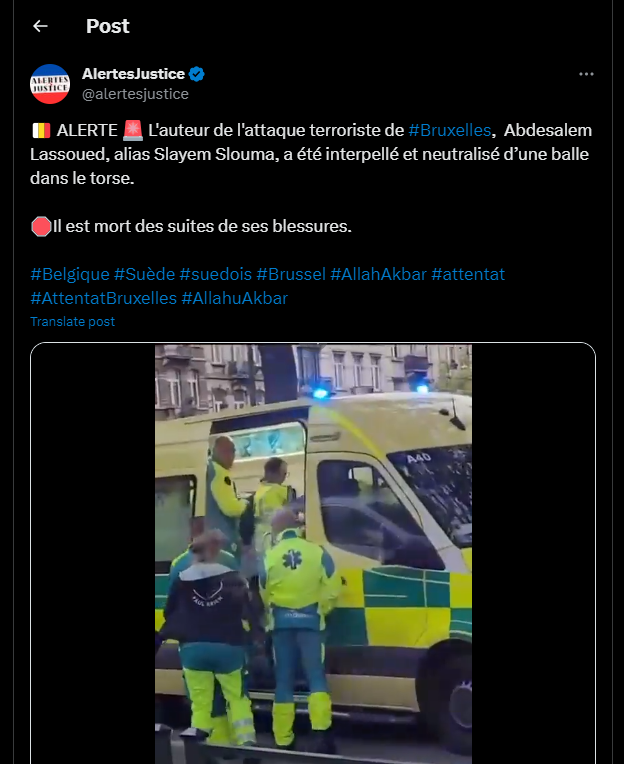 🇧🇪 ALERTE 🚨 L'auteur de l'attaque terroriste de #Bruxelles, Abdesalem Lassoued, alias Slayem Slouma, a été interpellé et neutralisé d’une balle dans le torse.