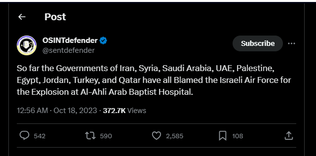Jusqu’à présent, les gouvernements d’Iran, de Syrie, d’Arabie saoudite, des Émirats arabes unis, de Palestine, d’Égypte, de Jordanie, de Turquie et du Qatar ont tous imputé l’explosion de l’hôpital baptiste arabe d’Al-Ahli à l’armée de l’air israélienne.