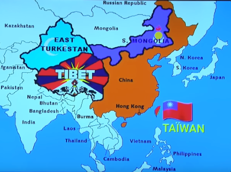 La Chine est également concernée par des programmes de démembrement. On voit notamment un projet de division avec la présence de Taiwan mais aussi et surtout celle d'un Tibet très étendu à l'ouest de la Chine auquel s'ajoute à l'extrême nord ouest, le Turkestan de l'est. Au nord, la Mongolie a sur cette carte pris des territoires à la Chine. Que ce soit Tchang Kai Tsek ou Mao Zedong, il étaient tous les deux d'accord pour unifier la Chine sous leur houlette. Ce qui est nouveau c'est que les Américains ont crée ou fait crée plutôt, un parti taiwanais indépendantiste. On parle beaucoup du Tibet également et même si on ne parle pas pour le moment de la Mongolie extérieure ou de manière résiduelle, cela va arriver bientôt certainement. Cela ne veut pas dire que la situation des Tibétains est merveilleuse. Il faut raison garder néanmoins. Et la description de génocide des Ouigours par les médias occidentaux est clairement exagéré. A noter que les seuls qui n'étaient pas astreints à la politique de l'enfant unique, ce n'était pas l'ethnie majoritaire mais bel et bien des minorités ethniques comme les Ouigours et les Tibétains. Leur pourcentage dans la population chinoise a connu une augmentation. A comparé avec le génocide des Amérindiens en Amérique et leur pourcentage dans la population américaine au fil des années qu'on puisse voir le niveau d'hypocrisie et de mensonges qu'on atteint certains médias occidentaux. Il ne faut pas oublier les financements du Dalai Lama par la CIA. La rencontre de Rebiya Kadder avec George Bush à la maison blanche est également à souligner en juillet 2008. C'était le deuxième président du World Uygour Congress. A noter que le Dalai Lama a refusé de condamner les actions de George Bush en Irak