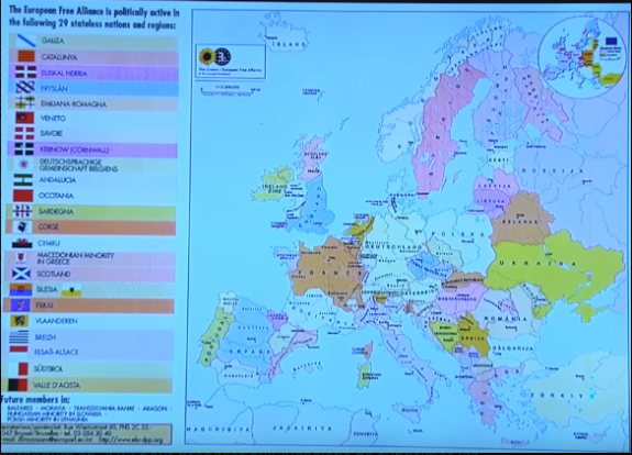 Un petit rappel concernant le projet des euro régions est également utile car il existe une carte qui circulait chez les Verts Allemands notamment au parlement européen. Avec The European Free Alliance, il avaient fait cette carte et c'est fait pour soit disant défendre le droit des peuples et leurs langues. A noter qu'ils ont strictement maintenu l'Ukraine comme s'ils ne savaient pas que l'est et la majorité du sud ouest ukrainien est russophone et russophile. En revanche, la France n'est pas épargné puisqu'ils ont séparé la Bretagne du reste de la France. A noter la séparation de l'Alsace également. A noter que l'Occitanie est également séparée. Ils ont eu la précision de rattacher les Pyrénées Orientales à la Catalogne. A noter qu'il s'agit d'une revendication d'indépendantistes catalans, ces mêmes indépendantistes qui ont une antenne à 300 mètres du bâtiment de la Commission européenne à Bruxelles. La même chose arrive à l'Espagne avec la Catalogne mais aussi avec la Galicia et l'Euskal Herria. L'Italie est également concernée, du moins le nord de l'Italie ainsi que le Royaume Uni avec l'Ecosse dont une partie de la population veut devenir indépendante afin notamment de rester dans l'Union Européenne suite au Brexit. Sur cette carte enfin, des territoires russes sont désagrégées du côté des territoires russes proches de la Finlande au nord ouest. L'Allemagne est comme on peut le voir le pays qui tire son épingle du jeu. L'Autriche est également intégrée à l'Allemagne ce qui a déjà été fait en 1938. Un petit grignotage de la République Tchèque est également visible.