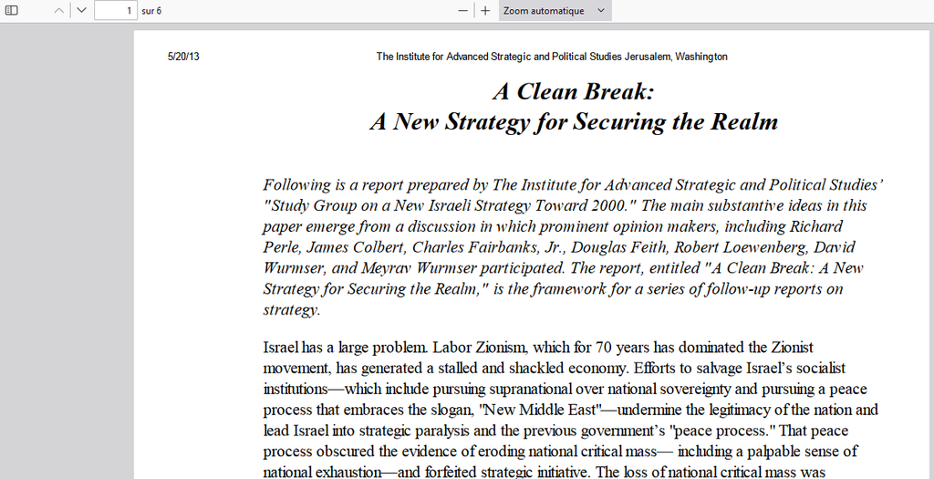 Il se trouve qu'en 1996, il y a plusieurs membres du PNACdont Richard Perle, Douglas Feith mais pas qu'eux. Ils avaient effectué la rédaction d'une étude au sein de l’Institute for Advanced Strategic and Political Studies pour Benjamin Netanyahou. Il était déjà le premier ministre israélien à l'époque. El famoso démocratie où le mec est encore au pouvoir après plusieurs décennies.
