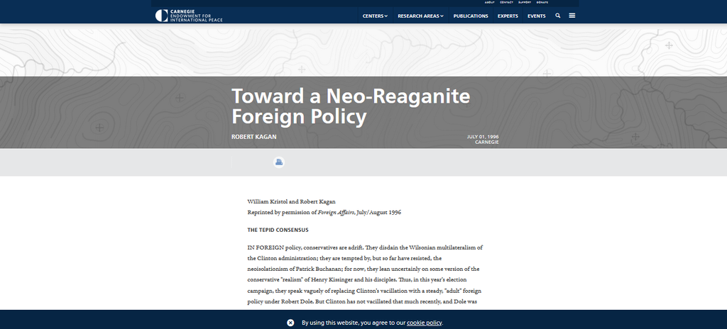 Une fois écartés du pouvoir du Bill Clinton, ils se sont infiltrés à Washington dans des think thank. Dans Foreign Affairs, William Kristol ainsi que Robert Kagan qui est l'époux de Victoria Nuland, a considéré que Bill Clinton avait une politique étrangère encore trop modérée et c'est pourquoi ils appelaient à ce qu'ils nommaient une « hégémonie bienveillante des États-Unis »