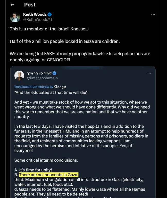 Nous sommes nourris d’une fausse propagande d’atrocités alors que les politiciens israéliens plaident ouvertement en faveur du GÉNOCIDE !
