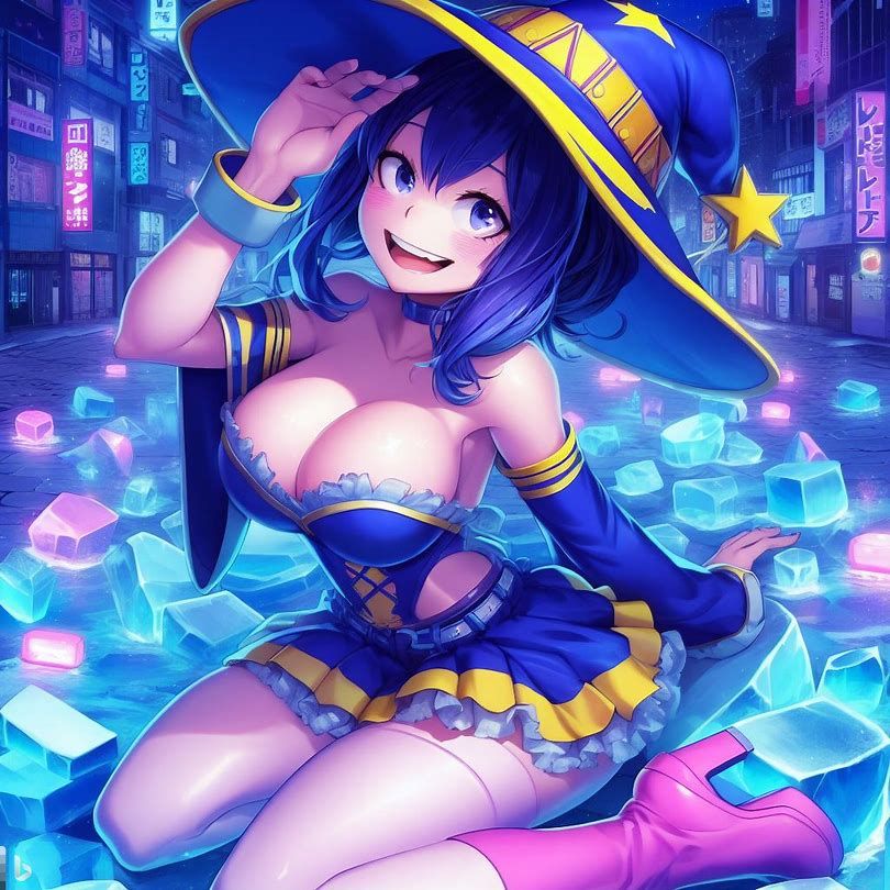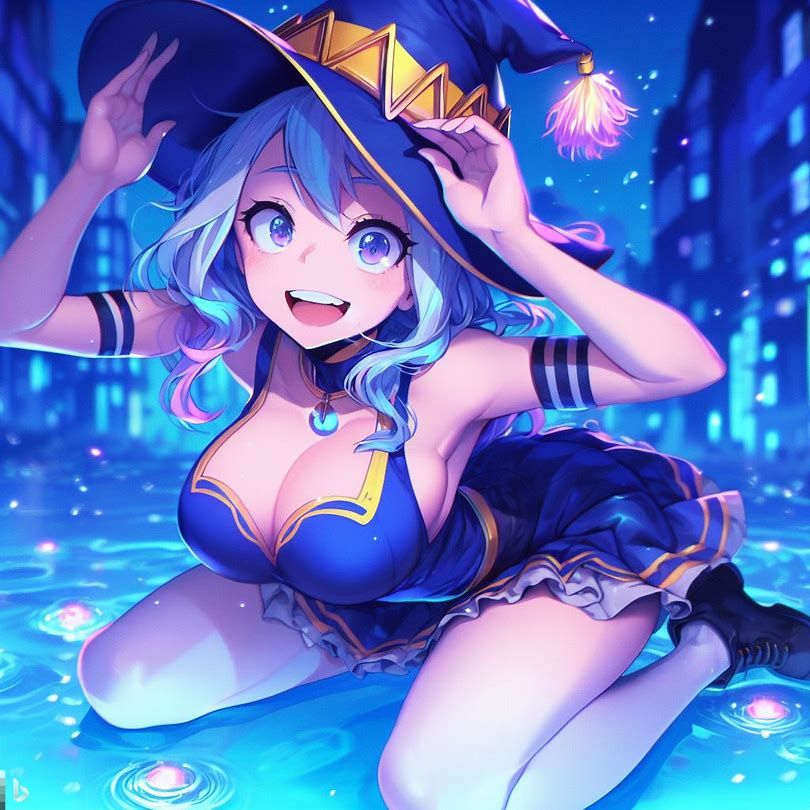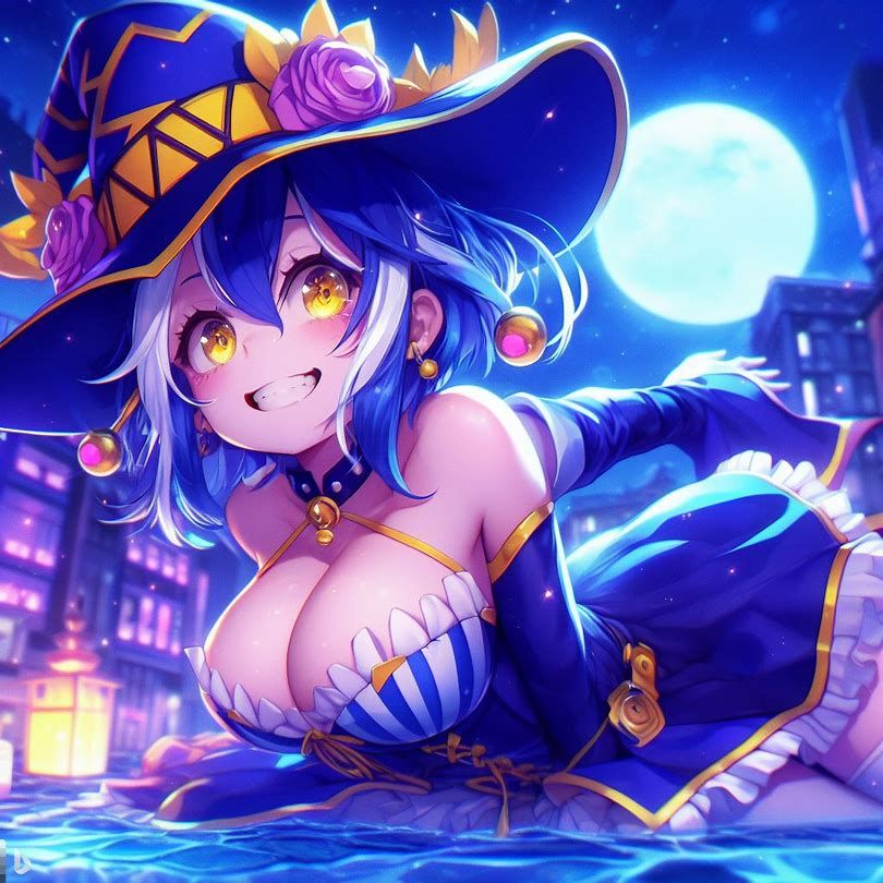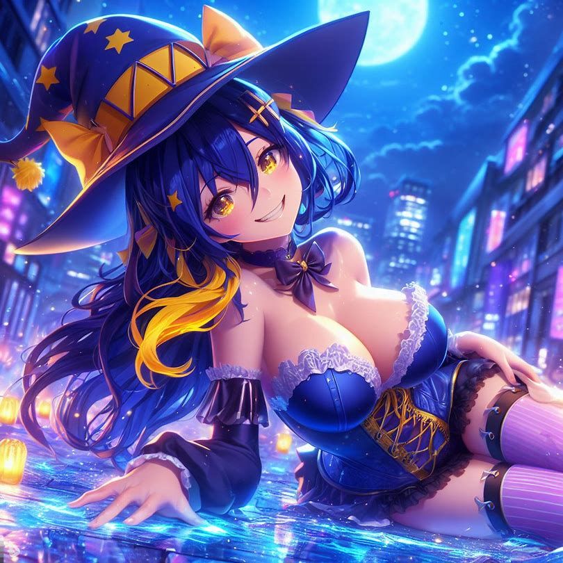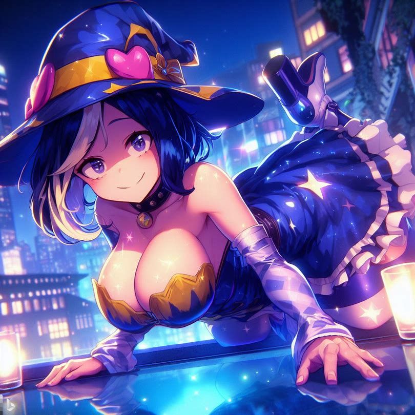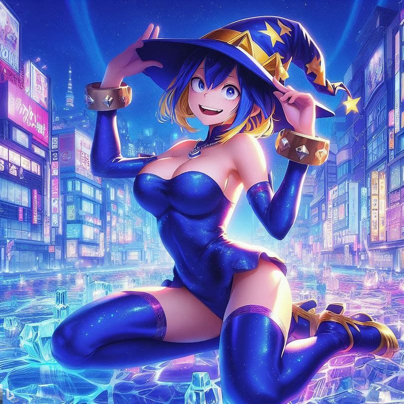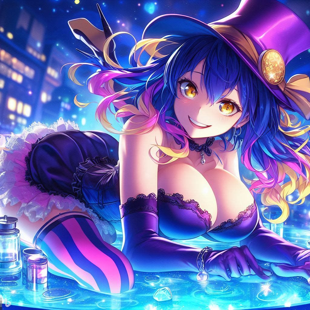 blue yellow pink purple jinxheroacademia ,on a blue light glaced fontain, lie on the left bent ,with magical hat, japan city background,smirk teeth smile, open midle bustier puffy , skirt fly hig, light moon reflect, detailed,anim3D art