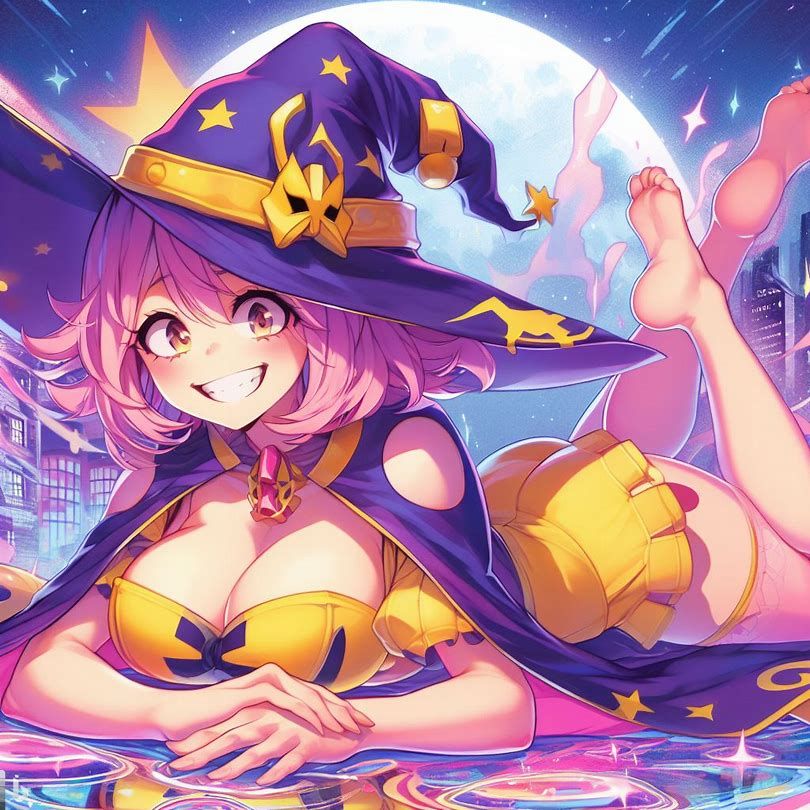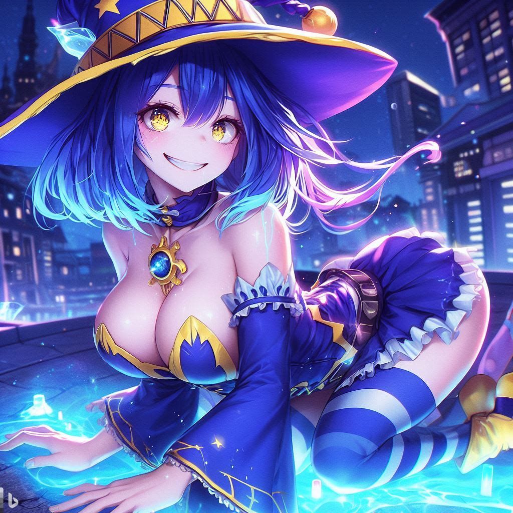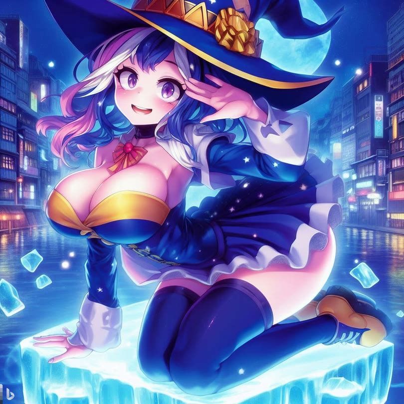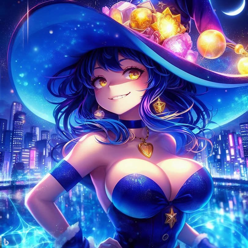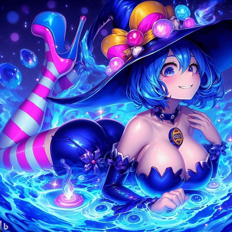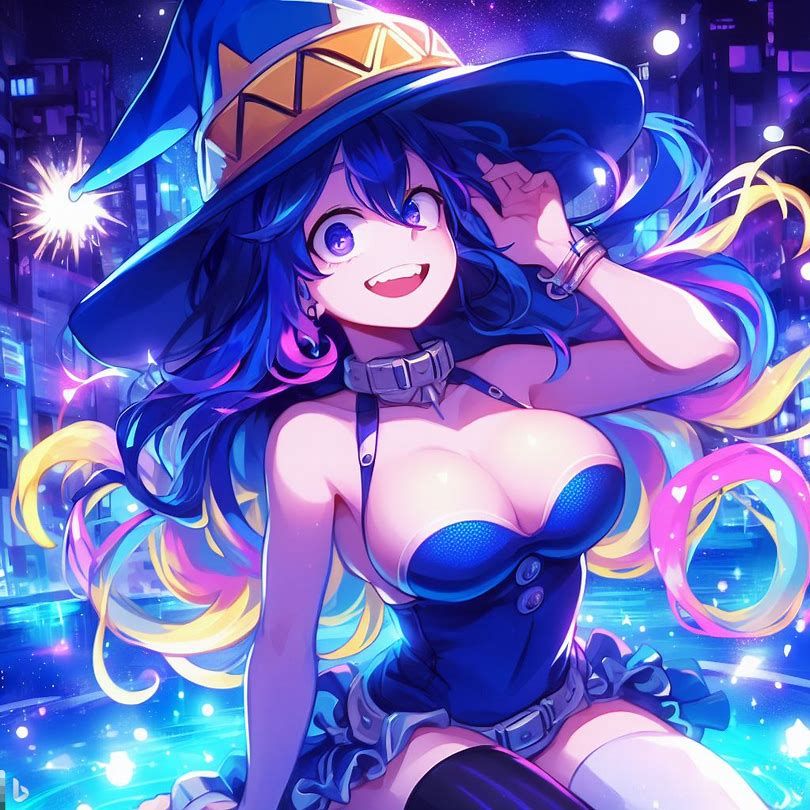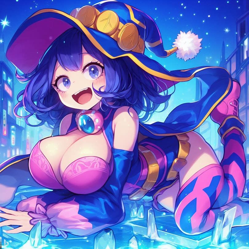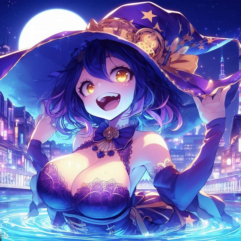blue yellow pink purple jinxheroacademia ,on a blue light glaced fontain, lie on the left bent ,with magical hat, japan city background,smirk teeth smile, open midle bustier puffy , skirt fly hig, light moon reflect, detailed,anim3D art