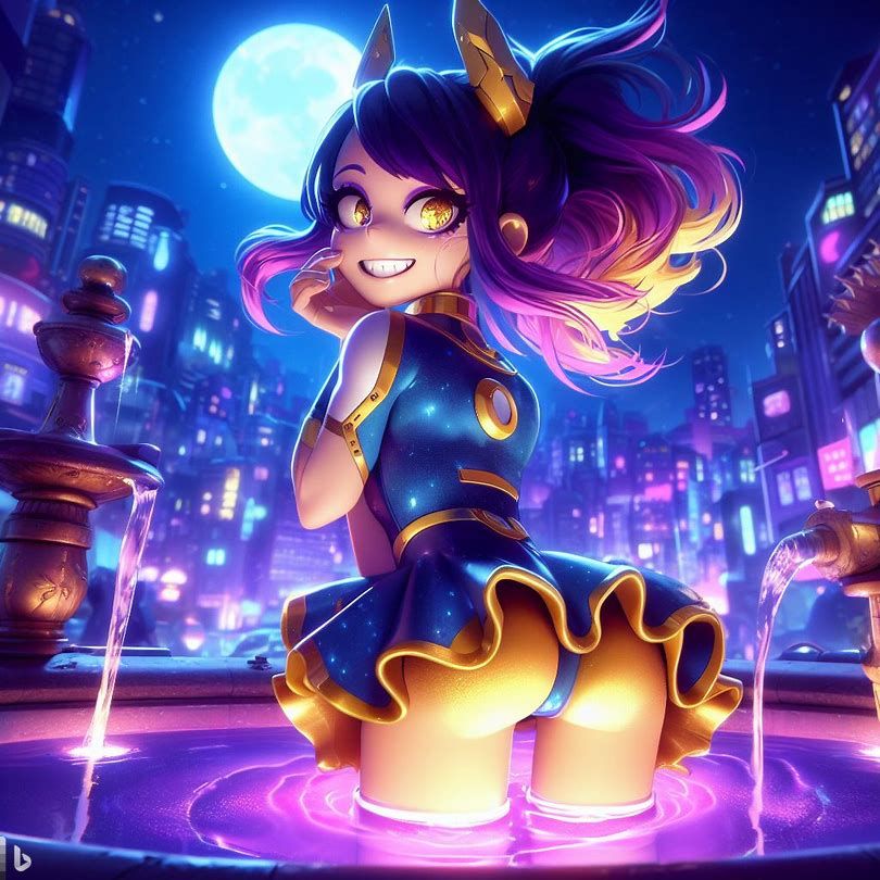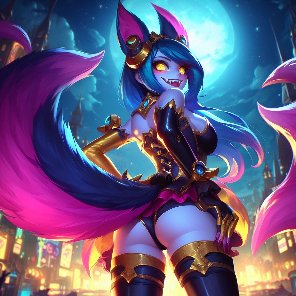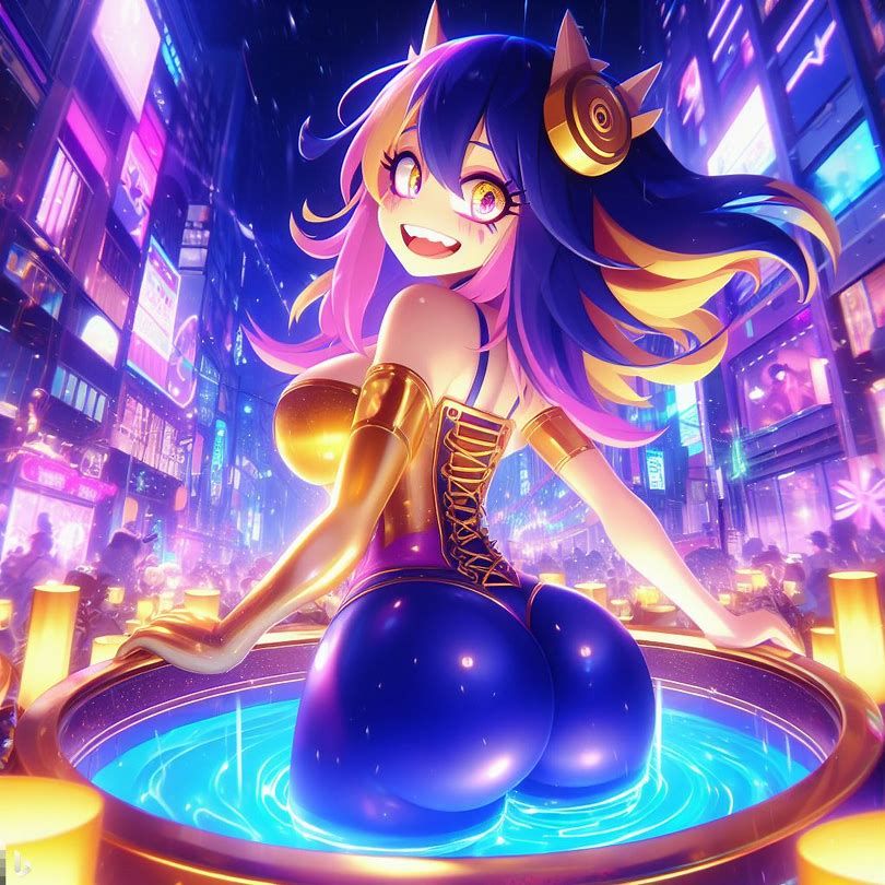 pink bodypaint vampire myheroacademia ,looking back ,facing a dark miror,fox tail, gold city background,smirk smile,light moon reflect,gold light eyes, Digital art, extremely detailed