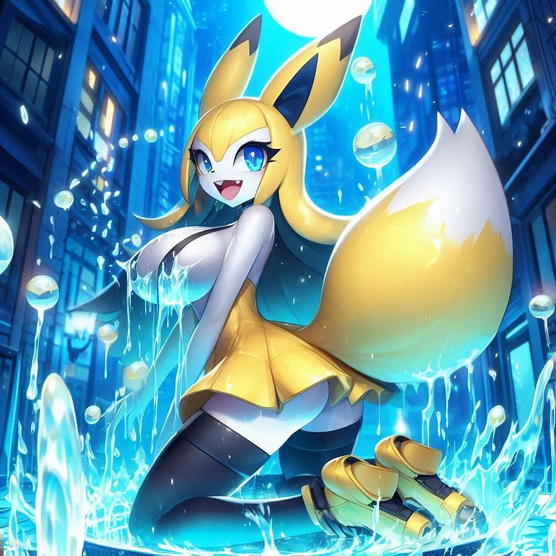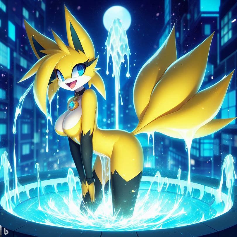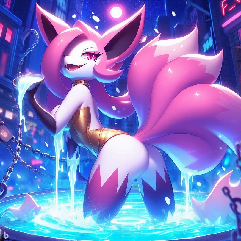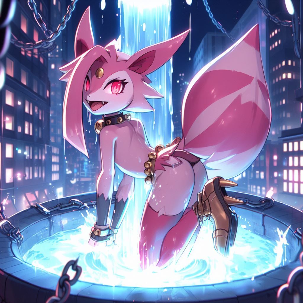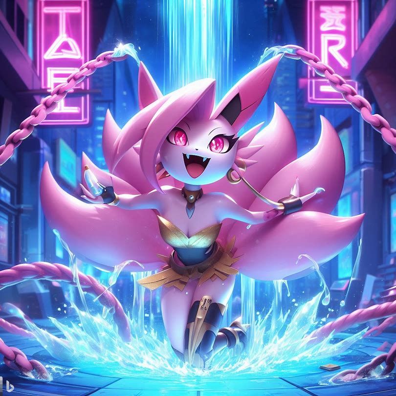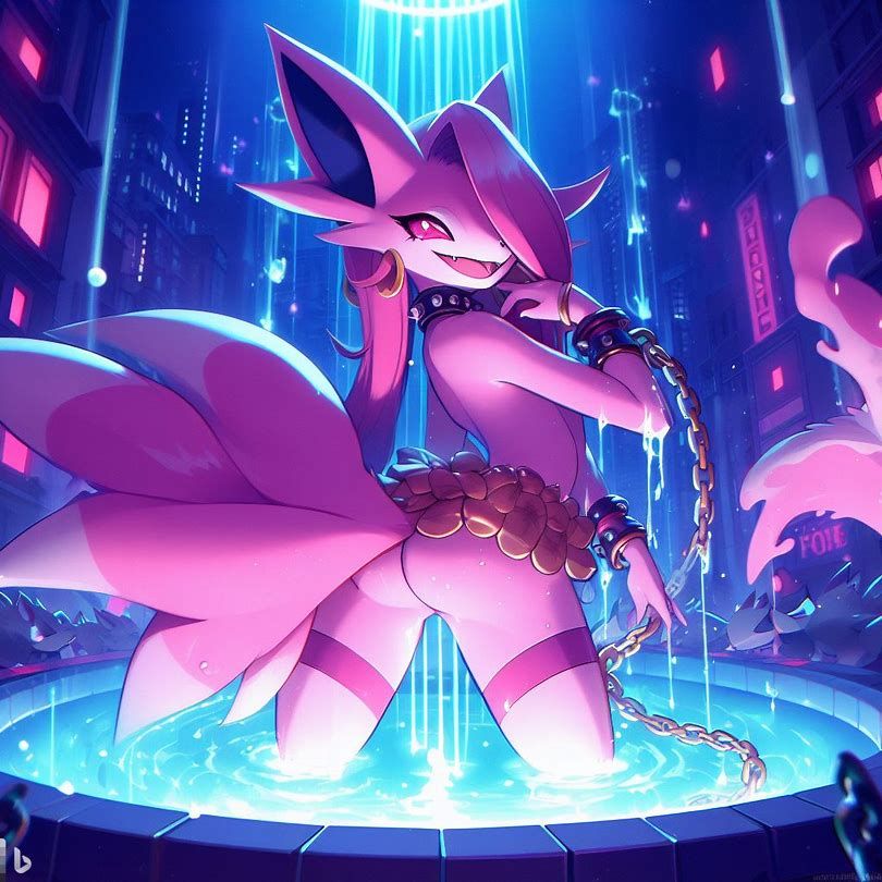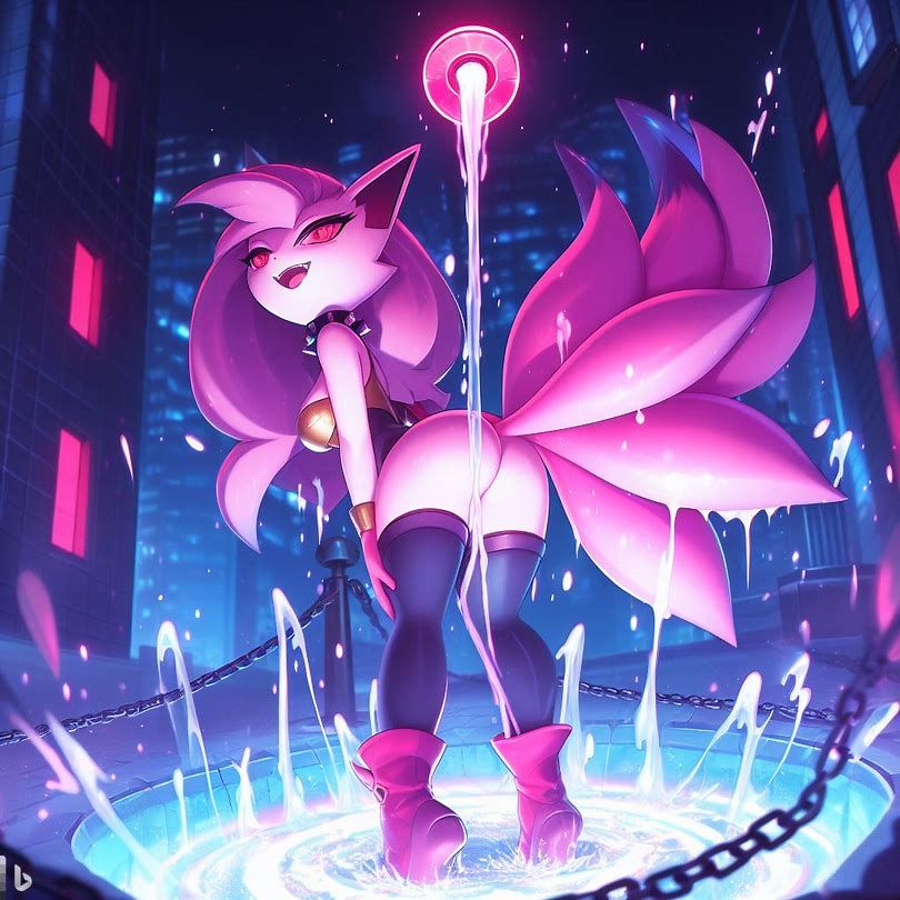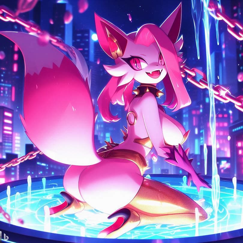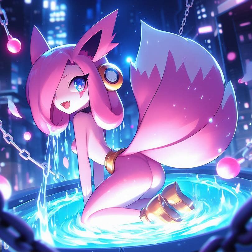 pink jinxgardevoir pokemon , inside a fontain of blue light,surrounded by chain , spiting coconut milk like rain, cyberpunk city background, smirk big teeth smile, looking back,golden corset shorty ,fox tail, higboots,red light moon reflect, anim3D art