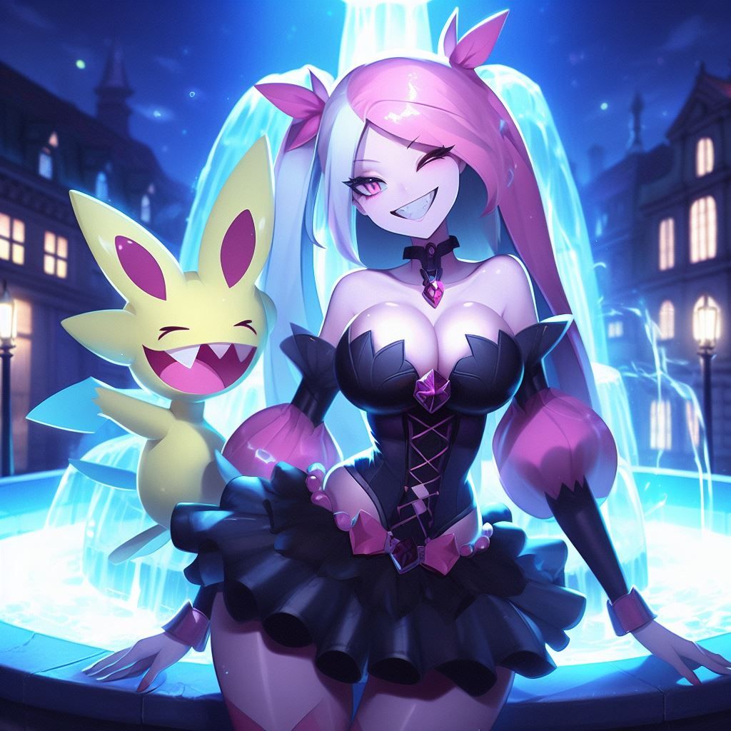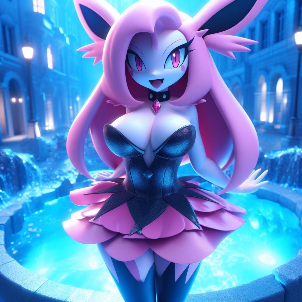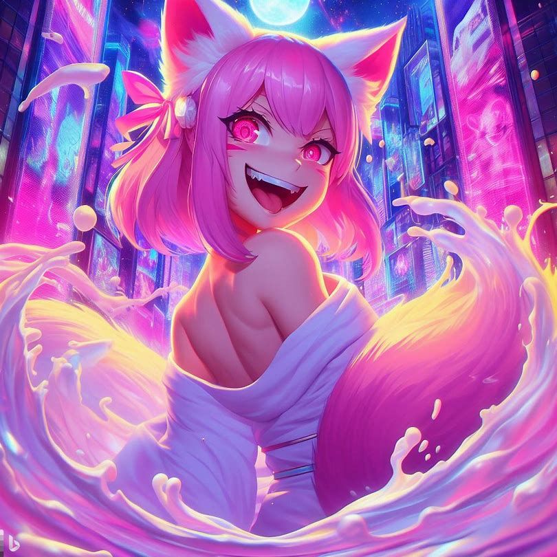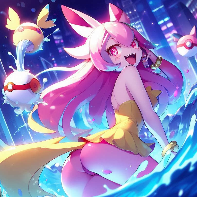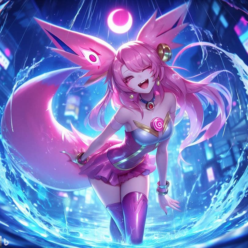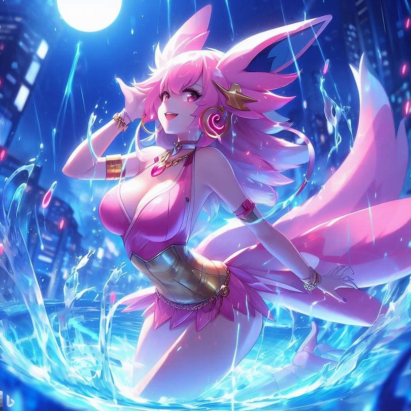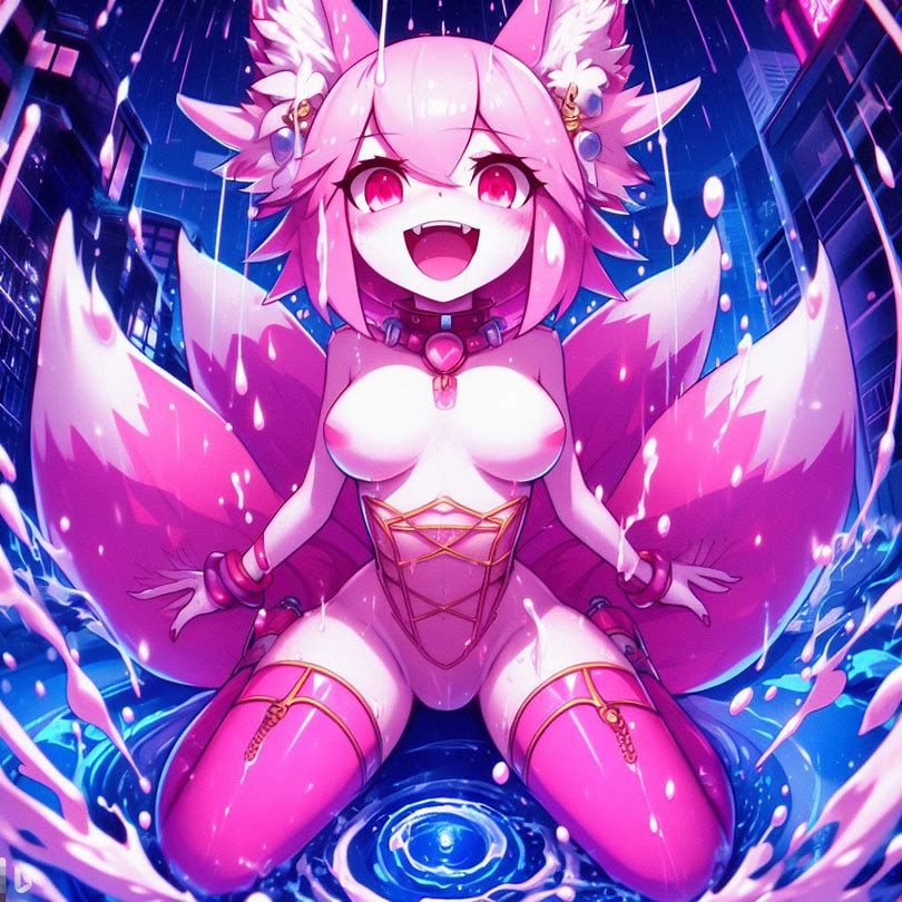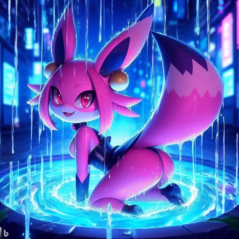 pink jinxpokemon , inside a fontain of blue light, blue raining, head under the water, bellow views 90° , spiting coconut milk like rain, cyberpunk city background, smirk big teeth smile, looking back,golden corset shorty ,fox tail, higboots,red light moon reflect,red eyes, anim3D art