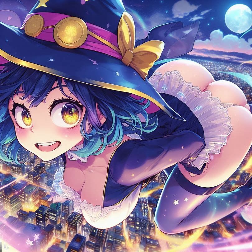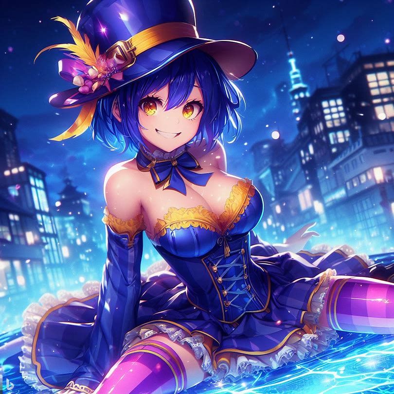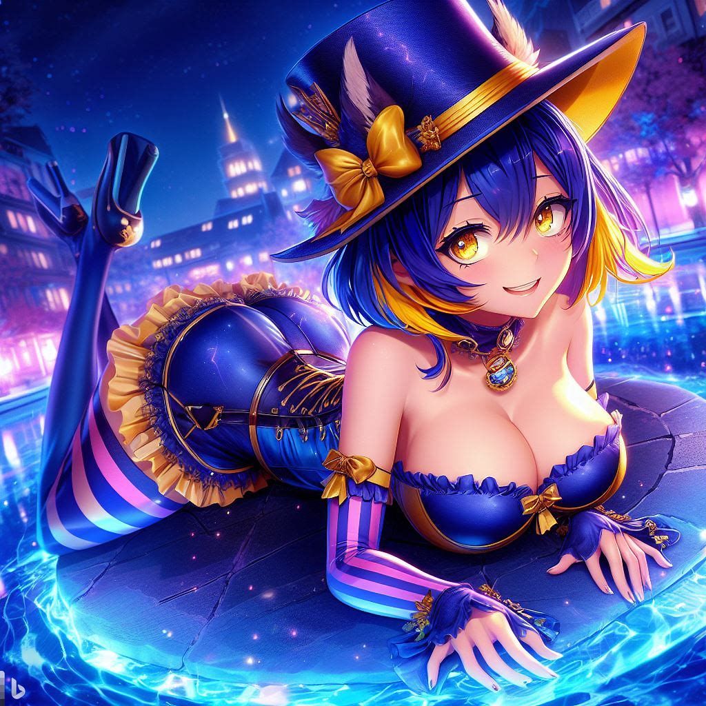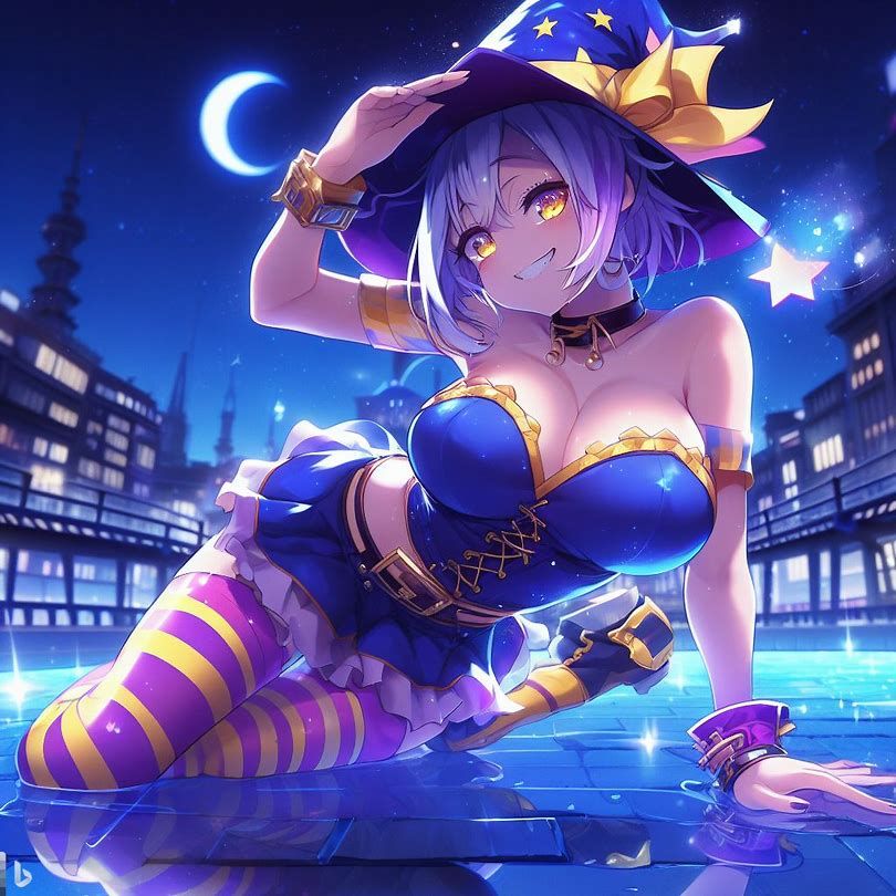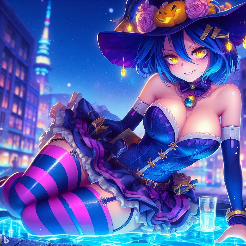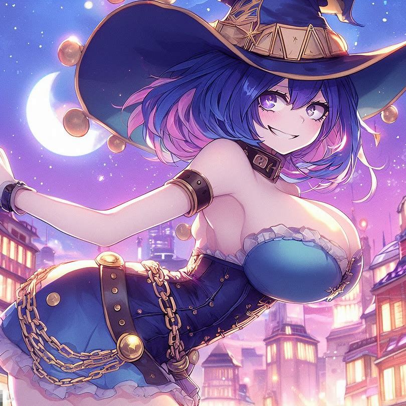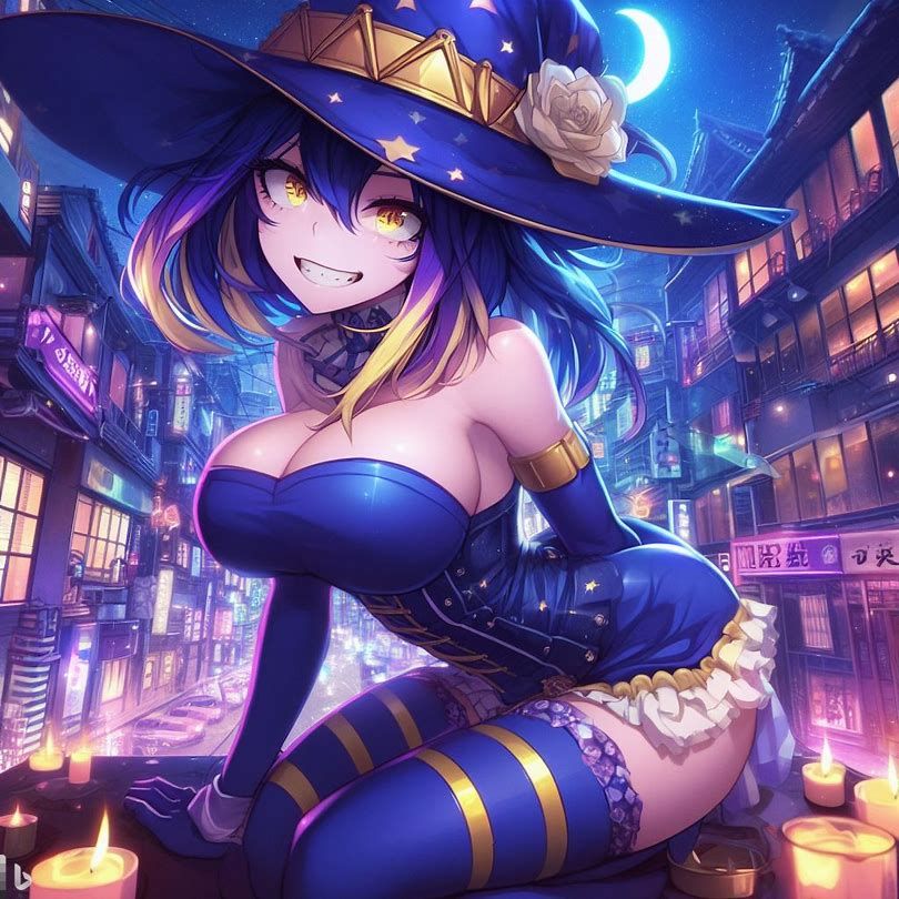 blue yellow pink purple girl jinxheroacademia ,presssed to the ground ,bottine,look curved back,with magical hat, japan city background,smirk teeth smile, XL corset cupless skirt, , light moon reflect,gold light eyes, Digital art, extremely detailed