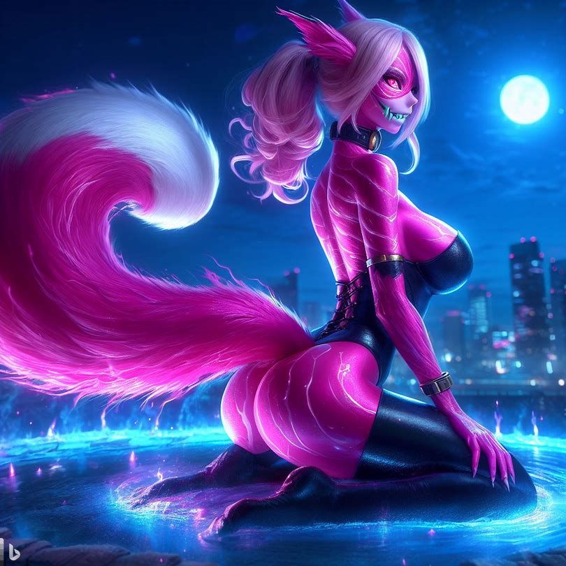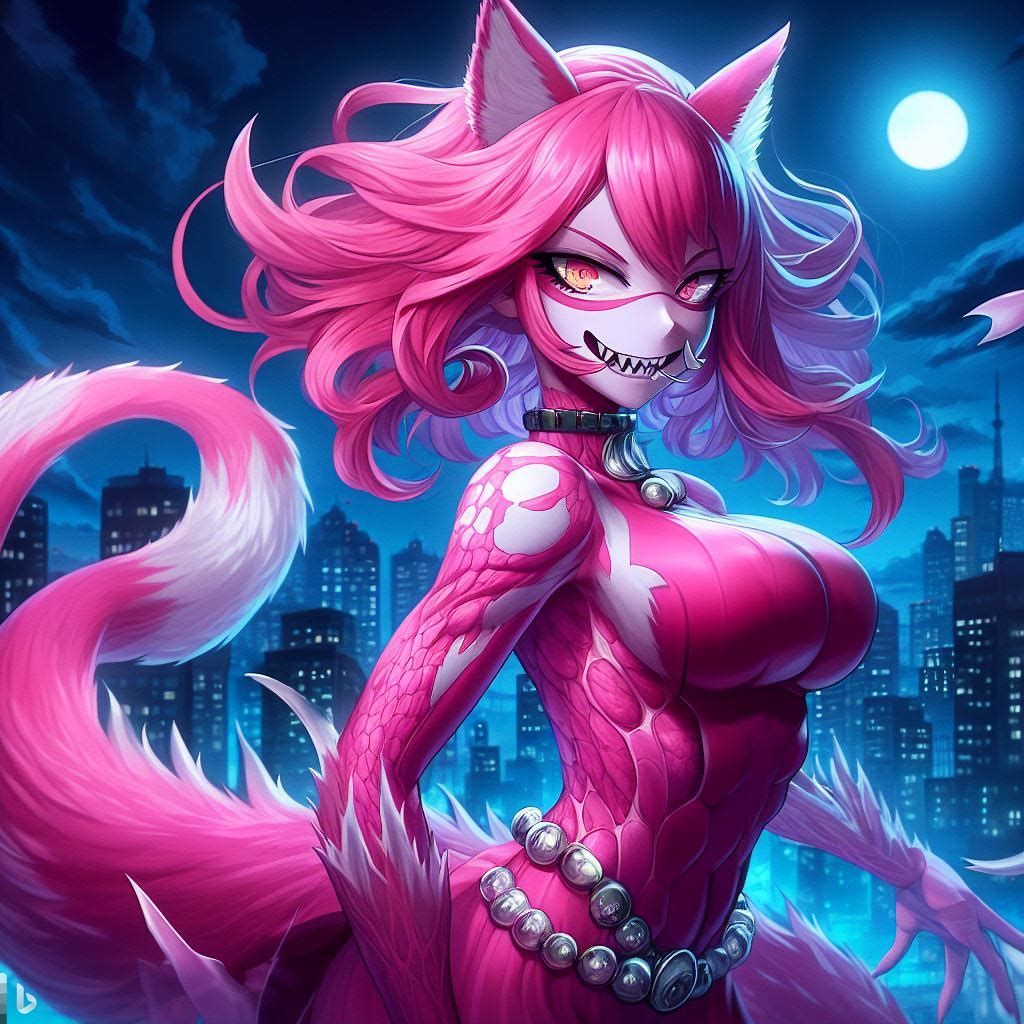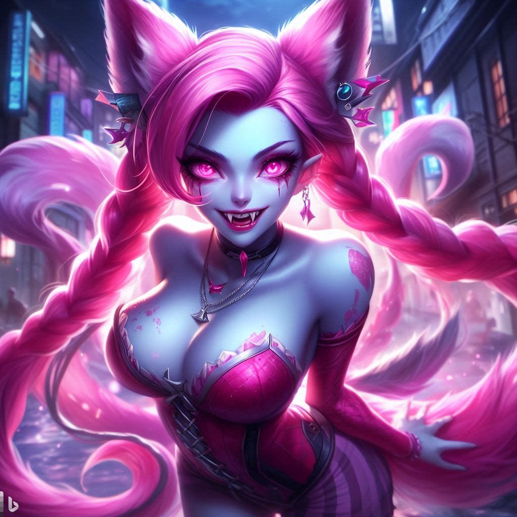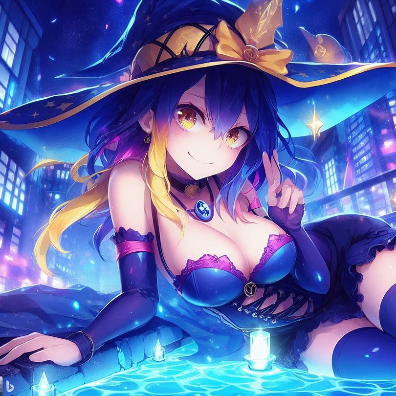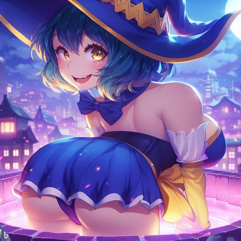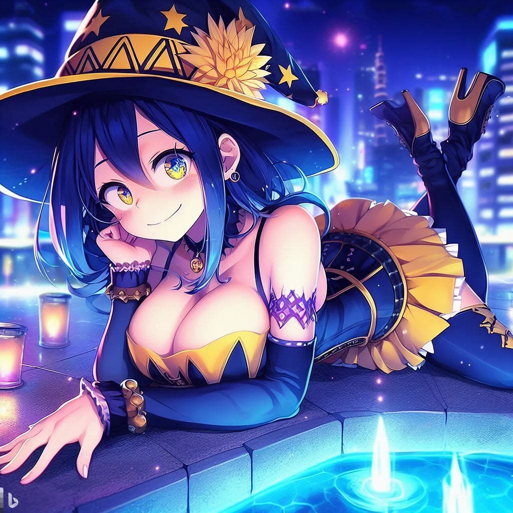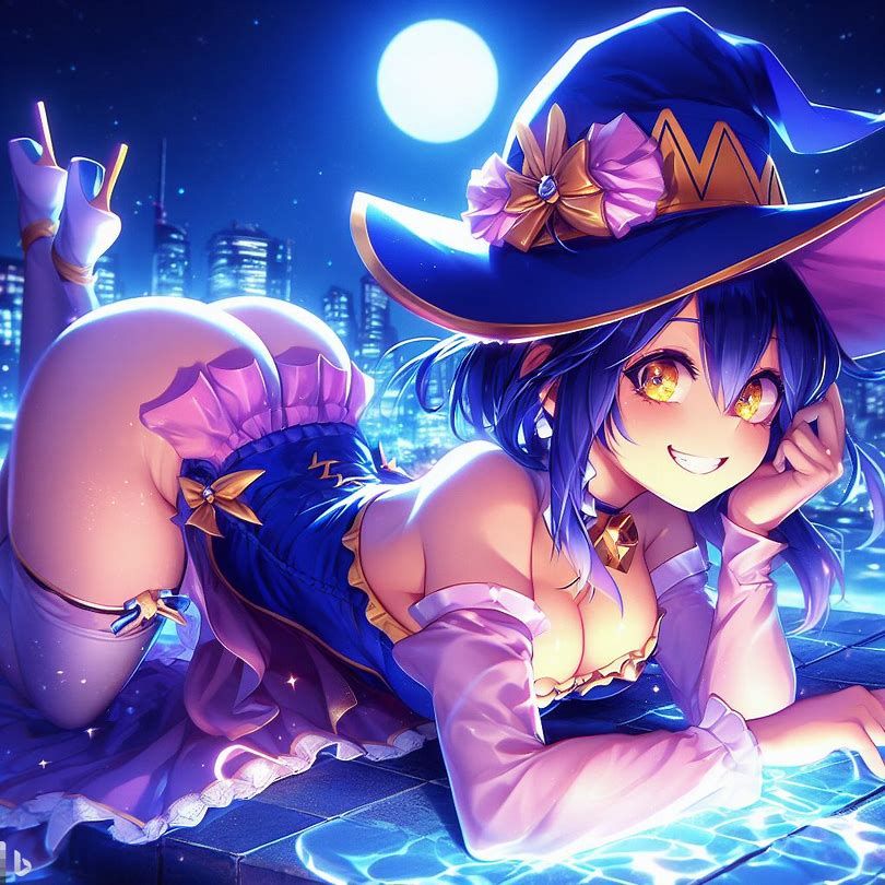blue yellow pink purple girl jinxheroacademia ,presssed to the ground ,bottine,look curved back,with magical hat, japan city background,smirk teeth smile, XL corset cupless skirt, , light moon reflect,gold light eyes, Digital art, extremely detailed
