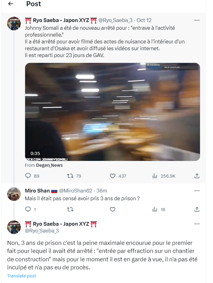 Il a été arrêté pour avoir filmé des actes de nuisance à l'intérieur d'un restaurant d'Osaka et avoir diffusé les vidéos sur internet.