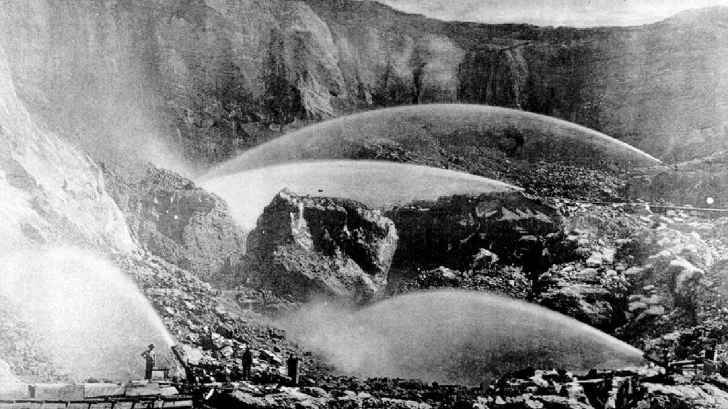 - Fin de la ruée : peu à peu, les chercheurs ont commencé à s’organiser en groupements, puis ce fut le tour des groupes industriels, seuls à même de financer l’achat de matériel toujours plus coûteux. Le chercheur solitaire finit par devenir un esclave salarié comme les autres, et le mythe du prospecteur finit par s’éteindre (pour un temps cependant). A coup de grands canons à eaux, les mineurs s’attaquèrent ainsi directement à la montagne qui contenait l’or, laissant des cicatrices encore visibles aujourd’hui (l’or et la destruction de l’environnement c’est une longue histoire)