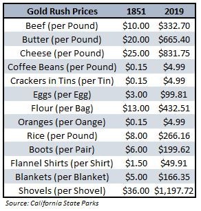 Une autre conséquence de cet afflux désorganisé est un coût de la vie exorbitant, les produits de base étant rares et devant être importés à grand frais. Ainsi, on a pu voir s’échanger des produits alimentaires contre de la poudre ou des pépites d’or, et une simple batée ou pelle pouvait se vendre plusieurs grammes d’or. Le logement dans une auberge sommaire pouvait coûter plusieurs dizaines de dollars par nuit (ce qui avec l’inflation correspond facilement à plusieurs centaines aujourd’hui). Ainsi, des quantités d’or qui aurait rendu n’importe qui riche ailleurs sur Terre suffisaient à peine à maintenir un niveau de vie acceptable au début de la ruée.