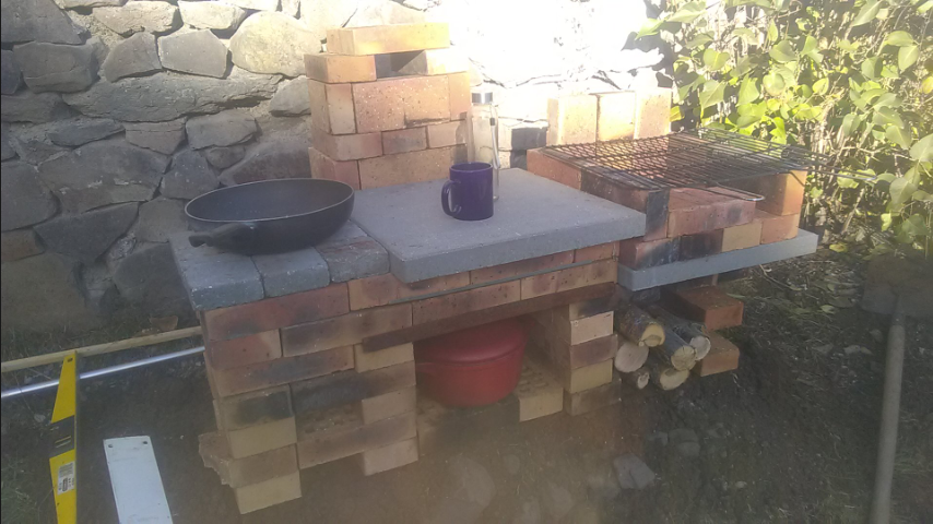 Donc en bas , le foyer du four (la où on fait le feu) , juste au dessus , le four qui sera fermé par une porte métallique bien sûr (pour pizza , pain etc). Sur le dessus , un barbecue , et à gauche un rocket stove.