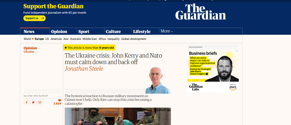 Jonathan Steele du Guardian avait à l'époque également écrit un article pour prévenir et dénoncer l'administration de Obama ainsi que l'OTAN pour avoir provoquer la crise. Le titre est : The Ukraine crisis: John Kerry and Nato must calm down and back off.