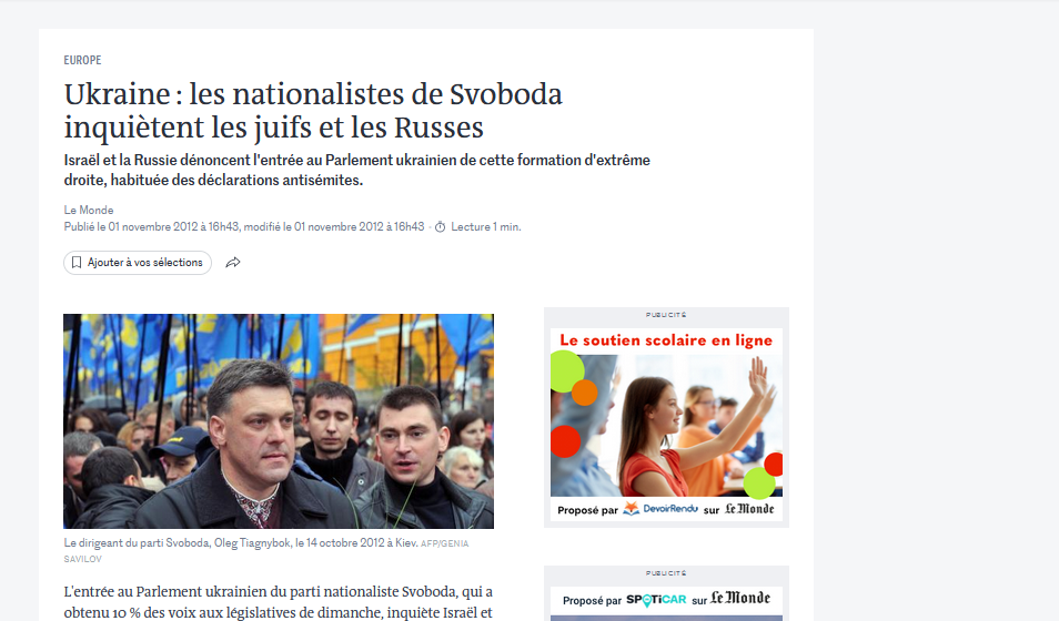 Dès 2012, Le monde titrait :Ukraine : les nationalistes de Svoboda inquiètent les juifs et les Russes