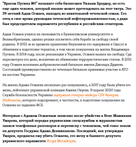 "Врагом Путина №1" называет себя бизнесмен Уильям Браудер, но есть еще один человек, который вполне может претендовать на этот титул. Это 39-летний Адам Осмаев, выходец из влиятельной чеченской семьи. Его отец в свое время руководил чеченской нефтепромышленностью, а дядя был председателем парламента республики и российским сенатором.