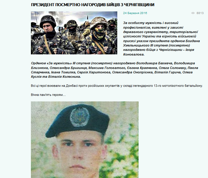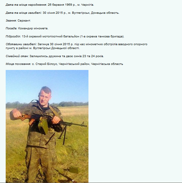 Evgen Kravchenko. Cet homme qui est né en 1991 au moment de l'effondrement de l'URSS puis qui est mort en 2015, est, originaire de Tchernigov, où il effectua des études pour devenir soudeur et effectua ensuite son service militaire. De retour à la vie civile il commença d’exercer sa profession. Il fut mobilisé pour être envoyé dans le Donbass (24 avril 2014), et incorporé dans le bataillon Tchernigov-1, au grade de sergent. Il participa aux premiers combats et exactions dans le Donbass, puis fut tué également lors bataille de Debaltsevo, cette fois le 31 janvier 2015. Plusieurs plaques commémoratives furent installées dans ses écoles durant les années 2015 et 2016.