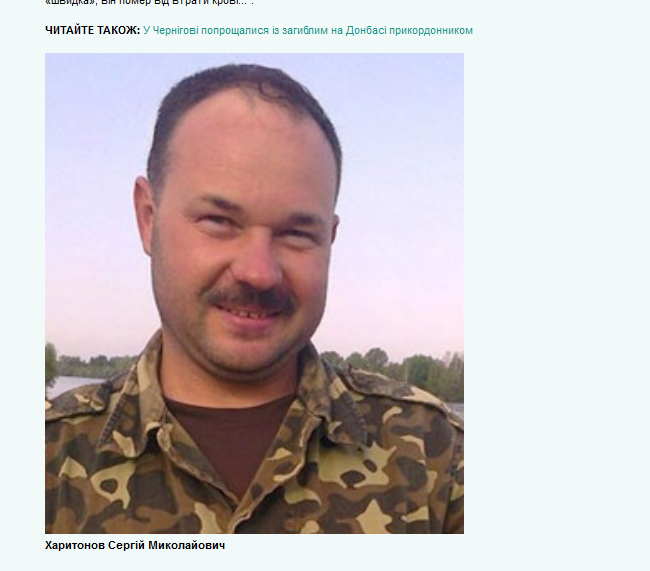 Vitaly Kolesnik. Cet individu est né durant l'année 1975 et est mort en 2015. Il est originaire de la région de Tchernigov. Il fit son service militaire dans les troupes de marine. Il fut mobilisé pour être envoyé combattre dans le Donbass à l'occasion du 1er septembre, puis il est incorporé au bataillon Tchernigov-1, comme sergent. Il fut tué sur le front du Donbass, le 30 janvier 2015, à l'occasion de la bataille de Debaltsevo, son corps resta longtemps sur le champ de bataille, fut ramassé par les partisans des républiques du Donbass puis identifié le 15 mars seulement. Il fut par la suite remis aux Ukrainiens.