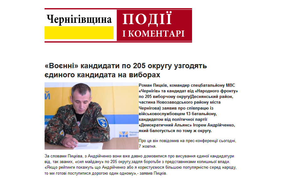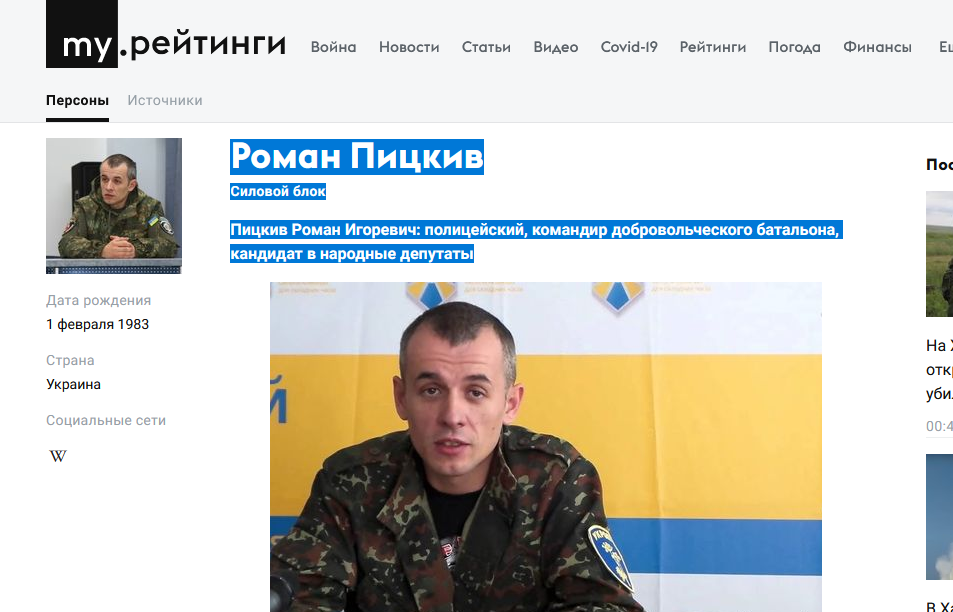 Roman Pitskiv. Cet homme là né en 1983 et est toujours en vie à l'heure actuelle en 2023. Il est originaire de la région d’Ivano-Frankovsk. On peut parler de bandériste pur jus. Il s'engage dans une compagnie d’autodéfense du Maïdan et participa aux émeutes et violences durant la révolution orange de 2014. Il fut l’un des piliers du recrutement à Tchernigov de la formation du bataillon, attirant à lui d’anciens sbires des compagnies du Maïdan et des ultranationalistes (avril-mai 2014). Il fut nommé au commandement du bataillon et le responsable des principaux crimes commis par ses hommes dans le Donbass (printemps-été 2014). Il fut mis particulièrement en cause pour les humiliations, les tortures et les violences commises sur des prisonniers insurgés, mais aussi sur les simples civils. Plus intéressé à la politique qu’aux combats, il laissa son bataillon et retourna à Tchernigov, puis fut nommé dans une commission militaire composée des principaux chefs de bataillons de représailles (août), dans le Parti Front Populaire, droite dure, fondé par le Premier ministre du moment Iatseniouk (également lié au Parti National-Socialiste d’Ukraine, Svoboda). Il se présenta pour ce parti aux élections législatives de la Rada, fut victime d’un grave accident de voiture dans la région de Tchernigov le 11 septembre de la même année. Gravement blessé, il ne fut par ailleurs pas élu dans la Rada (octobre). Son accident mis fin à sa carrière militaire et à son commandement. Lié à Arsen Avakov, l’éternel Ministre de l’Intérieur (2014-2021) et également membre du Parti Front Populaire, il fut utilisé avec des hommes de main pour des opérations et des raids, notamment contre une usine de confiseries à Jytomyr en 2016.