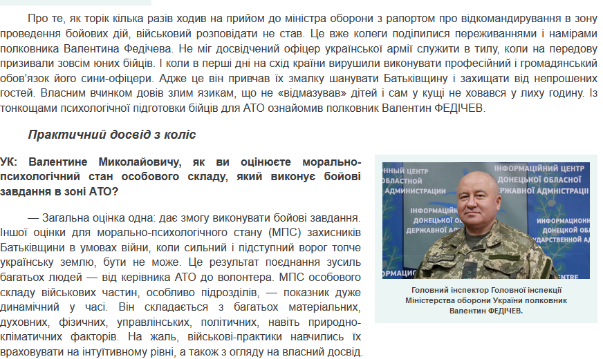 Andreï Fedichev. Cet homme là a des cosaques. Il est né dans la région de Lougansk, tout comme son frère. Son grand-père avait servi dans l’Armée Rouge durant la Grande Guerre Patriotique, passa devant un conseil de guerre et fut innocenté, puis envoyé dans la réserve, après la guerre il travailla longtemps dans une usine de munitions dans la région de Lougansk. Son frère Valentin, quant à lui est né en 1969 et mort en 2016. Lui aussi avait servi dans l’Armée rouge notamment durant la guerre d’Afghanistan entre 1979 et 1989, dont il revînt. Les deux frères s’enrôlèrent ensemble dans les bataillons de représailles, lui dans le bataillon Tchernigov-1, son frère étant nommé chef adjoint dans l’État-major de l’opération ATO. Il fut l’un des derniers à fuir le champ de bataille de Debaltsevo, indiquant avoir détalé dans une fuite éperdue durant deux jours et parcourant une soixantaine de kilomètres à pied (son frère qui aurait pu être de Marseille, déclarait qu’il avait parcouru 100 km), pour échapper au désastre du chaudron de Debaltsevo (février 2015). Il mourut plus tard d’une crise cardiaque (26 octobre 2016). Lui-même était officier de carrière dans l’armée ukrainienne, il servit dans les forces de maintien de la paix, notamment au Kossovo (2013-2014), et fut envoyé dans le bataillon Tchernigov-1, alors lieutenant-colonel. Il servit notamment dans la région d’Avdeevka non loin de Donetsk, puis fut envoyé dans le 137e bataillon de fusiliers-marins (2017), qu’il commanda peut-être jusqu’à ce jour.