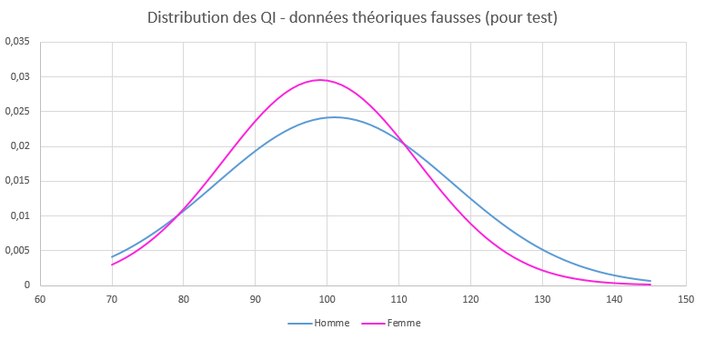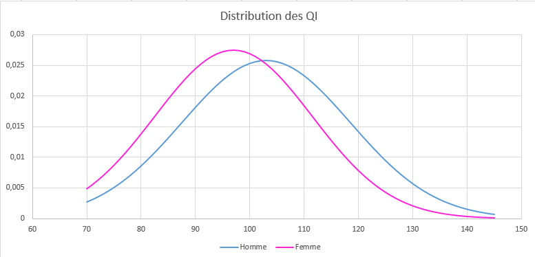 Je viens de tracer en quelques instants sur excel la distribution des QI masculine et féminine selon les paramètres des études citées en premier message, à savoir une différence de moyenne de 6 pts et une différence d'écart type de 1pts, que j'ai réparti équitablement autour de 100 pour garder une distribution qui respecte les standards du QI