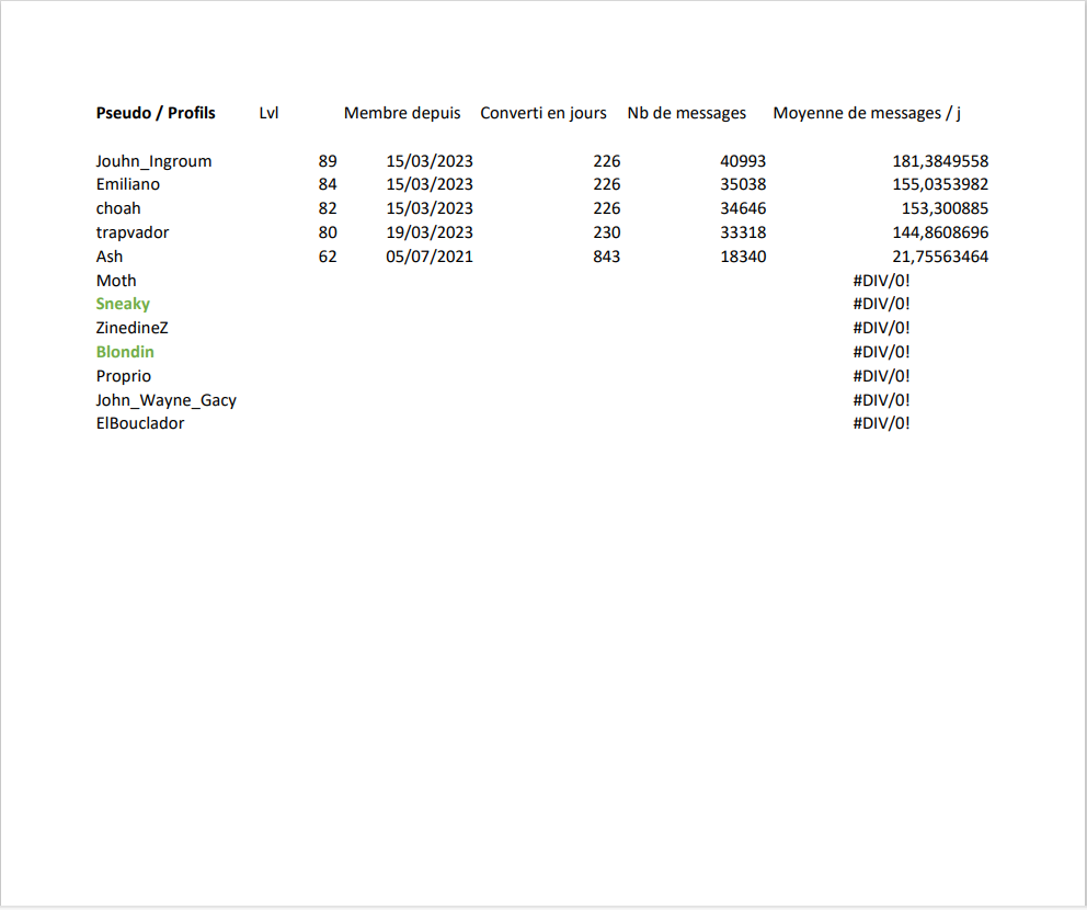 Par exemple, la première colonne sera les pseudo bien sûr, la seconde l'âge,ensuite leurs loisirs, ce qu'ils aiment et n'aiment pas, leurs salaires, si ils sont au RSA, à l'AAH, si il sont puceau ou quetard etc....