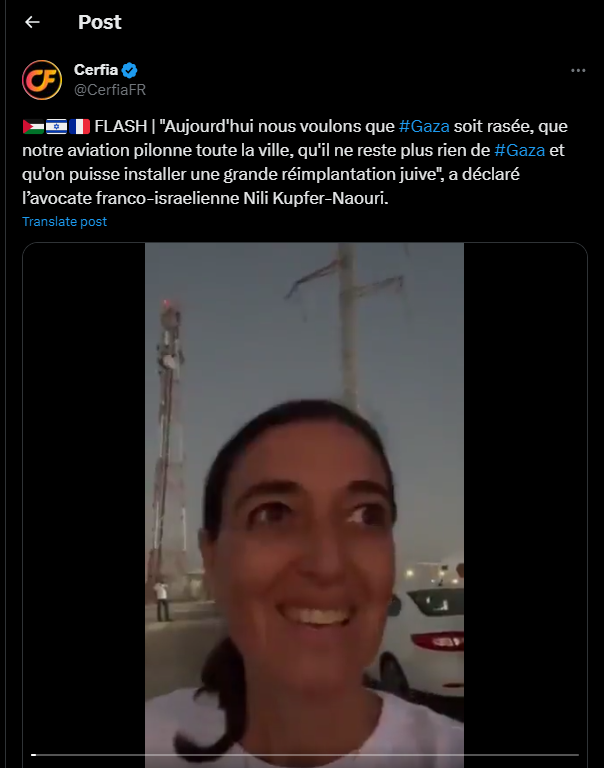 🇵🇸🇮🇱🇫🇷 FLASH | "Aujourd'hui nous voulons que #Gaza soit rasée, que notre aviation pilonne toute la ville, qu'il ne reste plus rien de #Gaza et qu'on puisse installer une grande réimplantation juive", a déclaré l’avocate franco-israelienne Nili Kupfer-Naouri.
